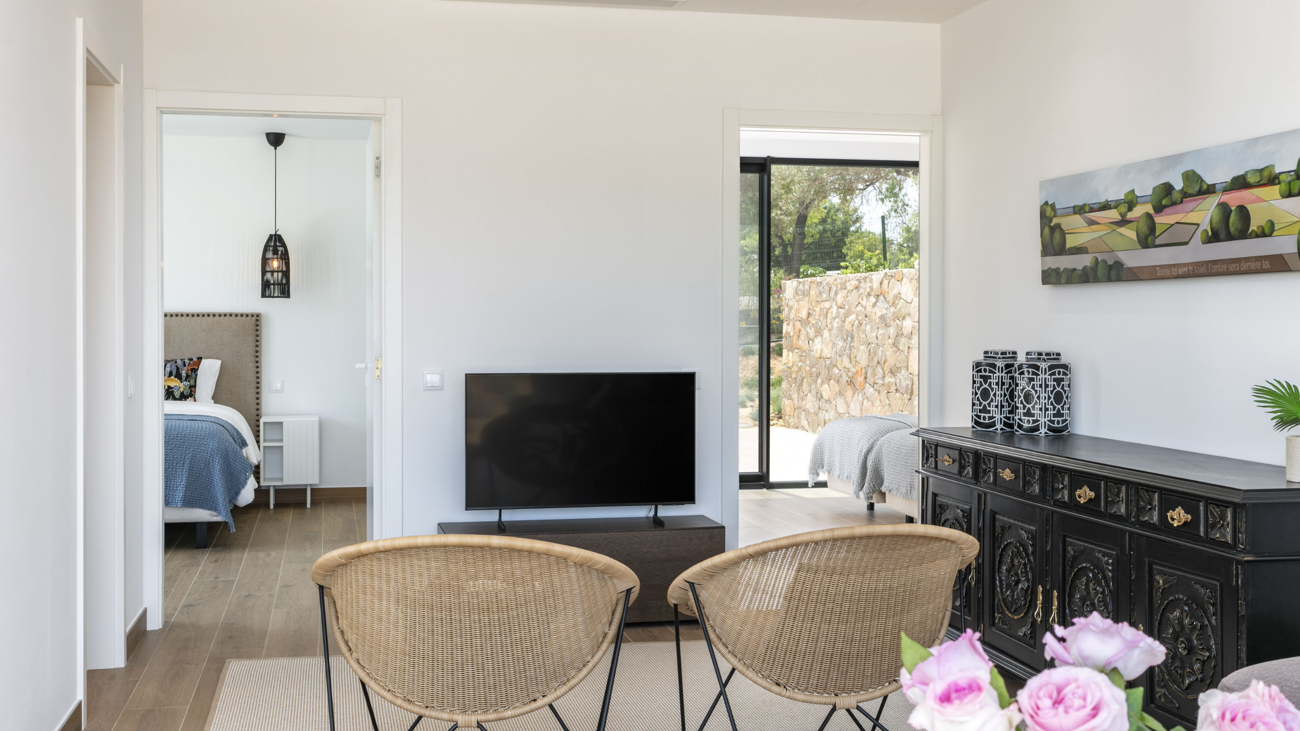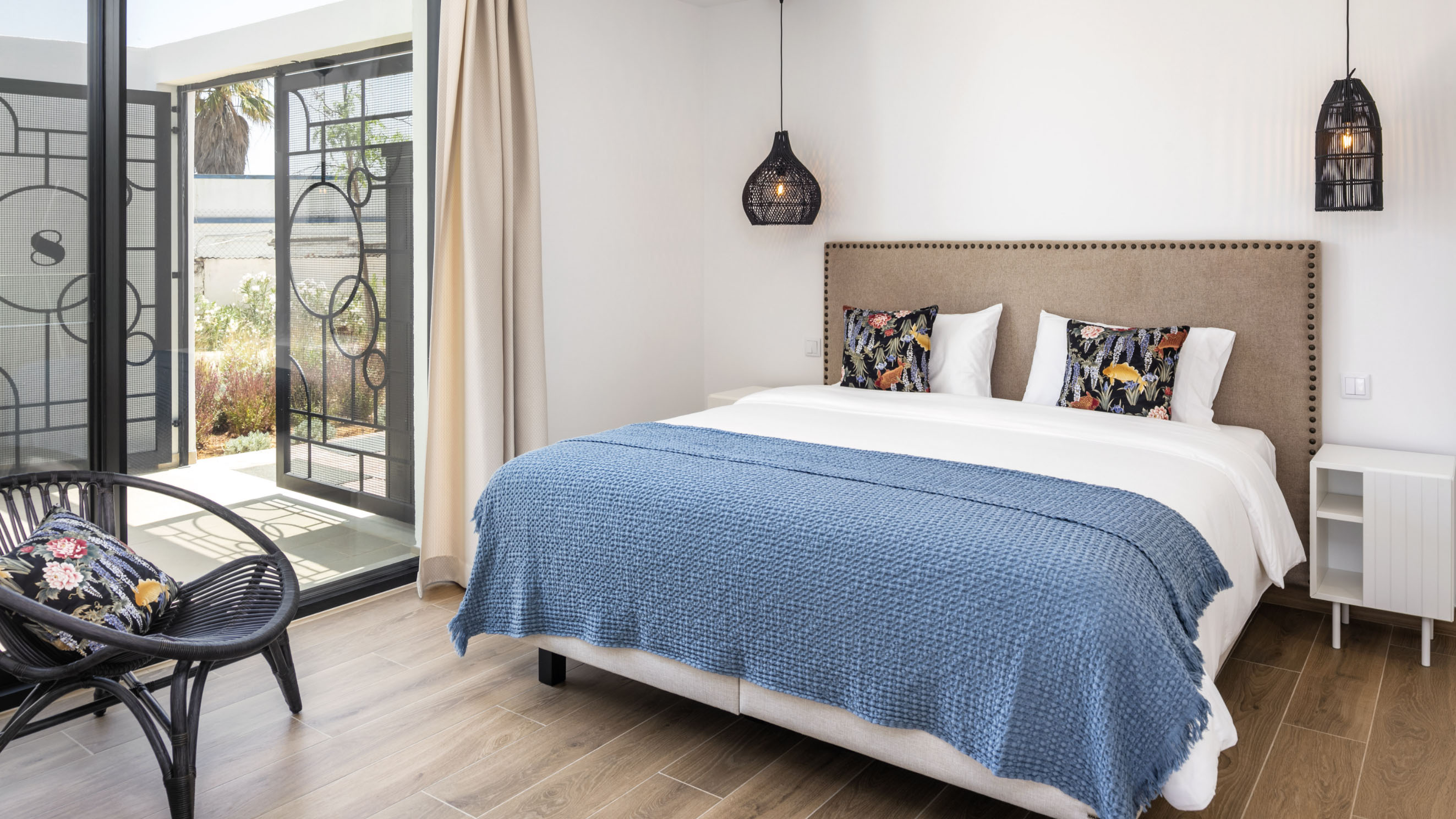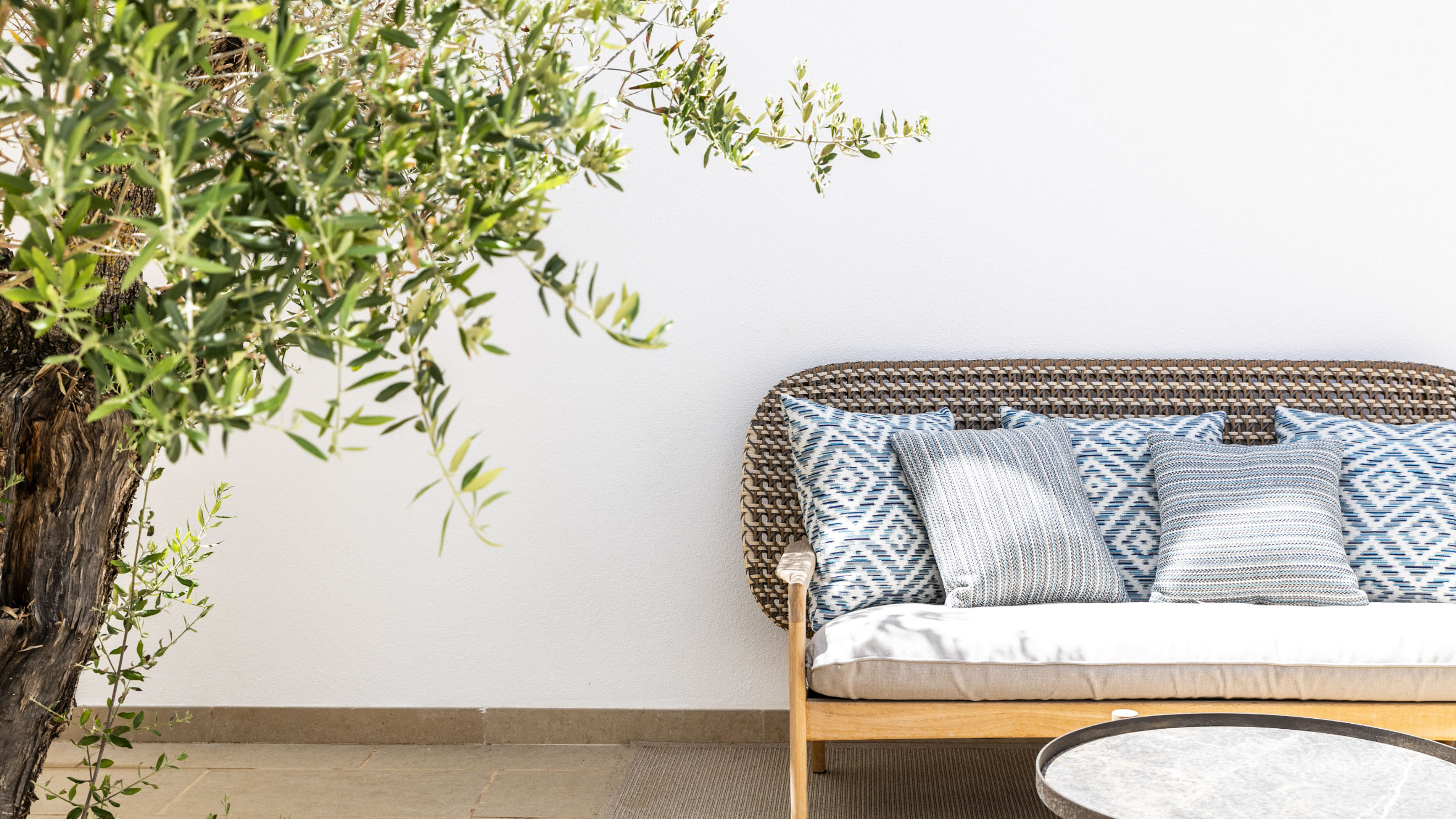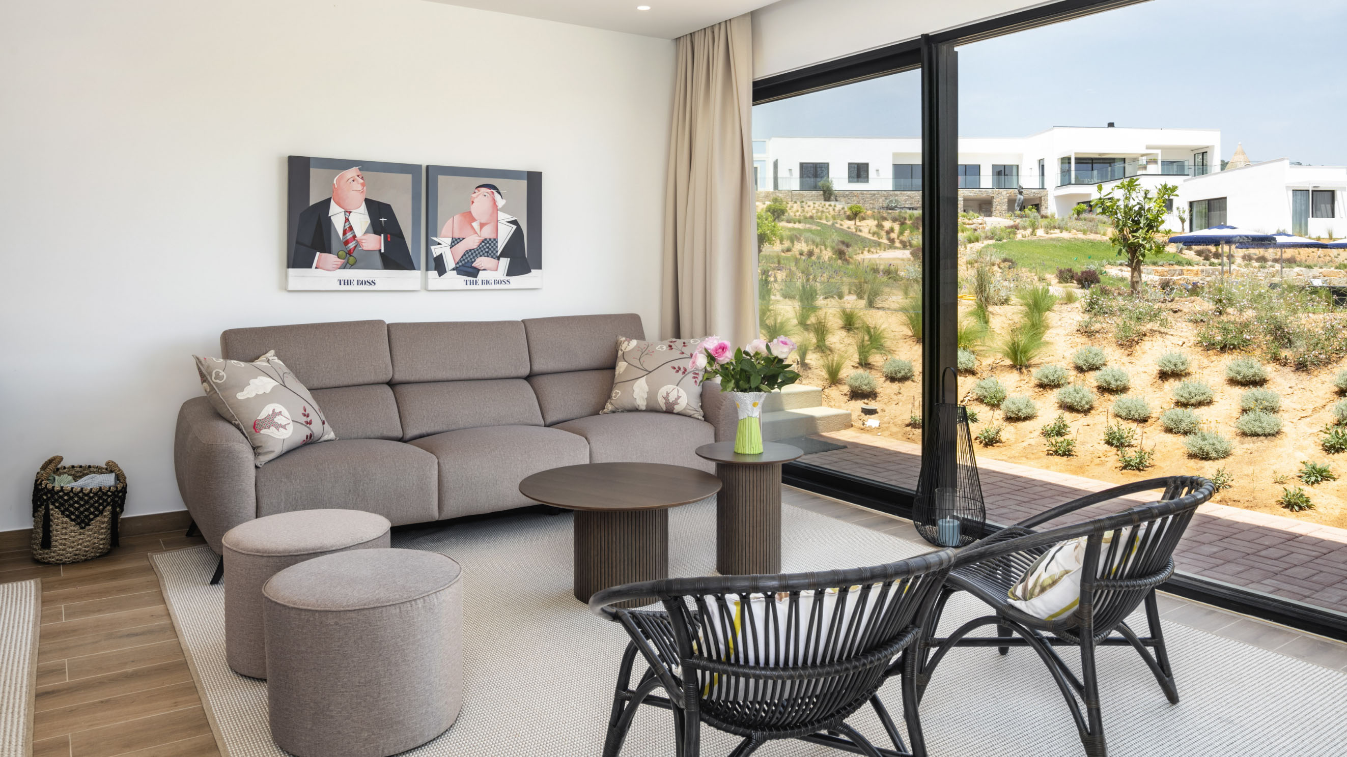 Our one-bedroom villas are thoughtfully designed to optimise elegant living spaces filled with natural light. Inside, a fully equipped kitchen with modern appliances, including a dishwasher, oven, and cooktop, flows seamlessly into a cosy living area, complemented by air conditioning throughout for your comfort. Each villa also offers private parking that leads directly to a secluded terrace, creating the perfect outdoor retreat in complete privacy. Please note that furnishings and décor may vary between apartments. Not all units are identical in layout or contents.