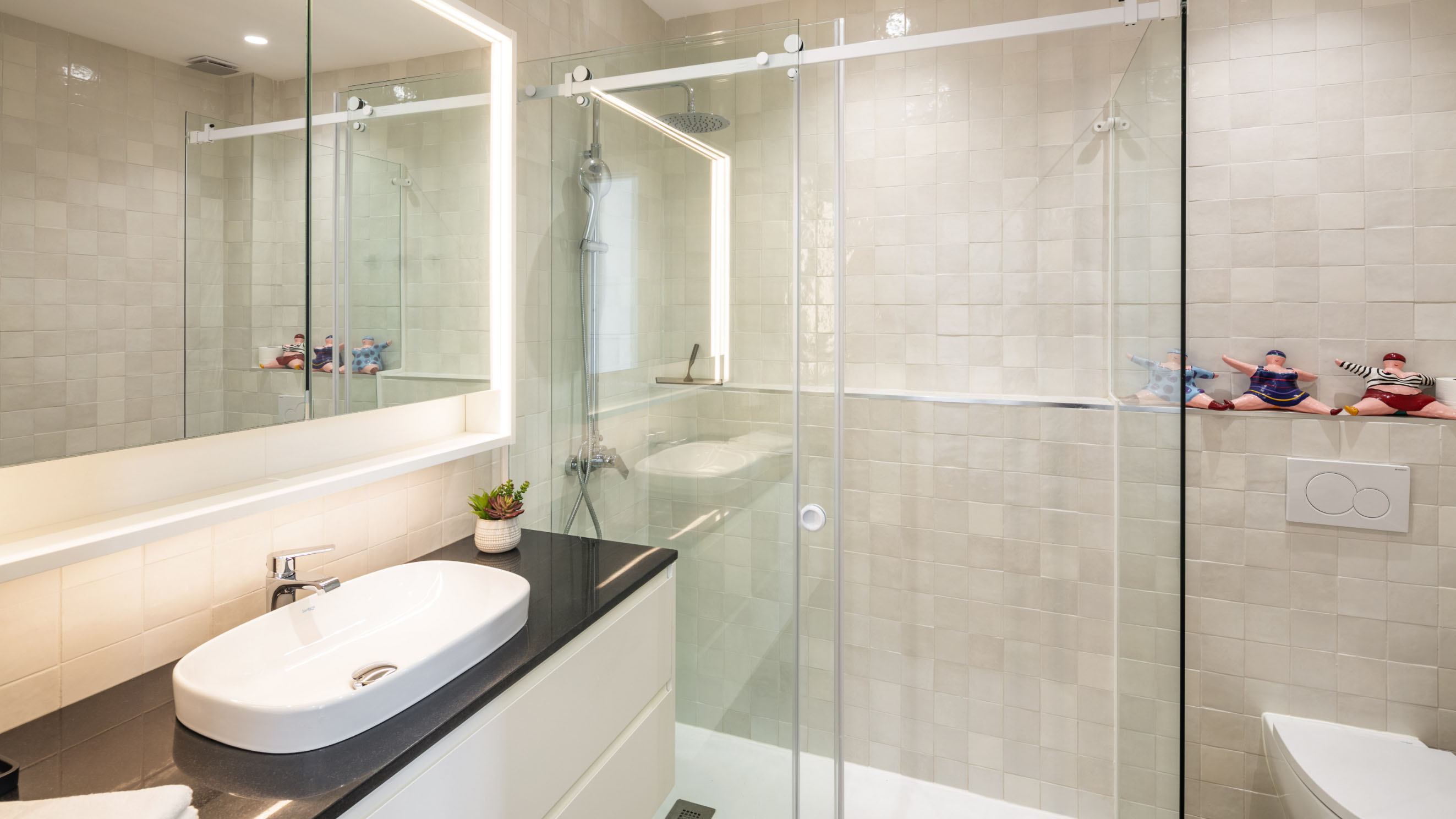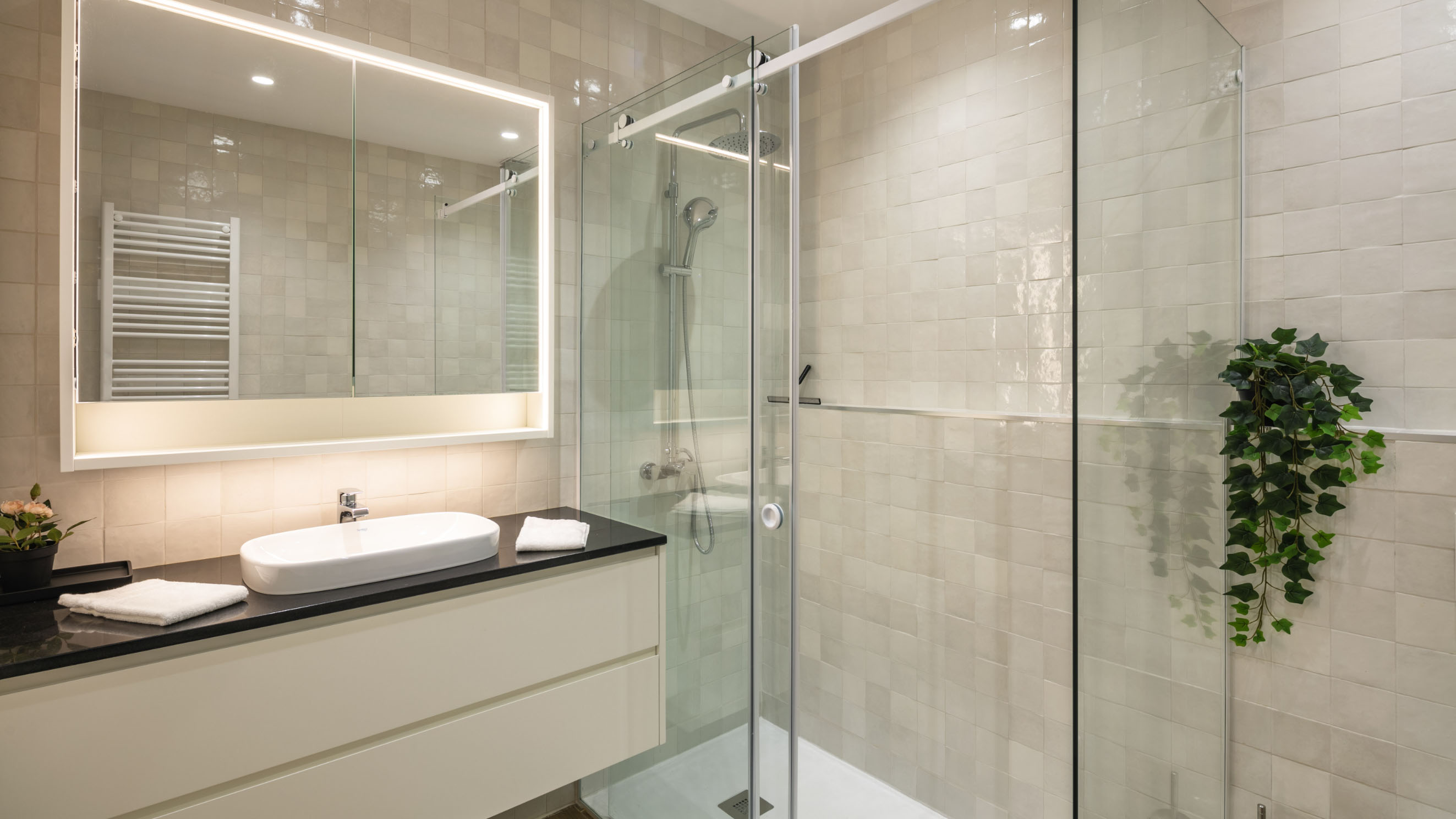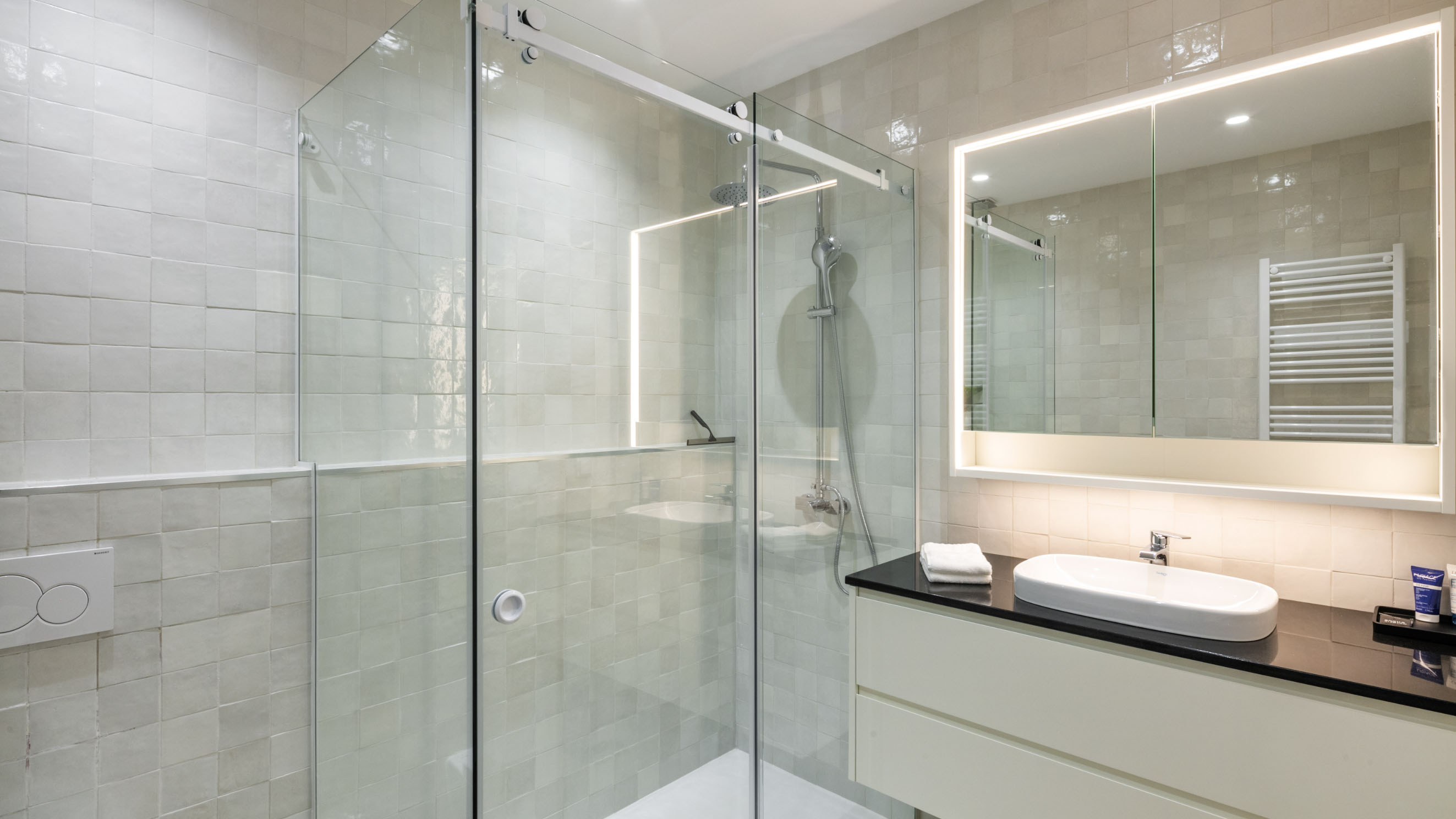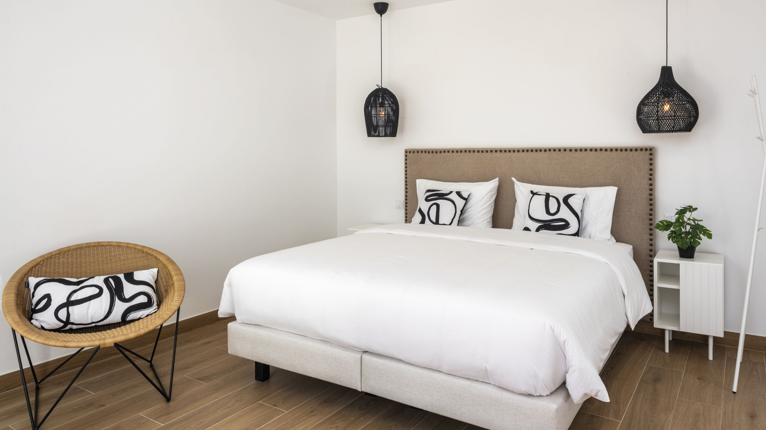 Our one-bedroom villas are thoughtfully designed to optimise elegant living spaces filled with natural light. Inside, a fully equipped kitchen with modern appliances, including a dishwasher, oven, and cooktop, flows seamlessly into a cosy living area, complemented by air conditioning throughout for your comfort. Each villa also offers private parking that leads directly to a secluded terrace, creating the perfect outdoor retreat in complete privacy. Please note that furnishings and décor may vary between apartments. Not all units are identical in layout or contents.